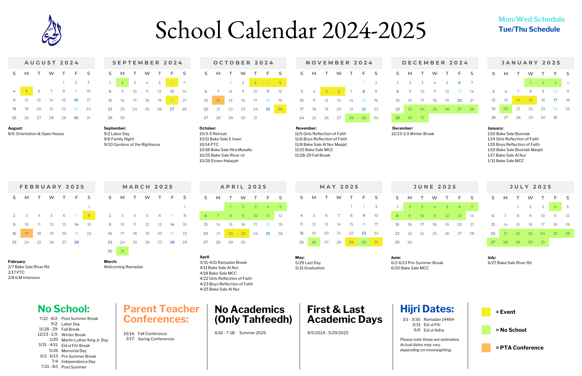 Keep up with important dates, events, holidays, and Islamic observances using our interactive academic calendar. Stay organized and aligned with your child’s schedule!